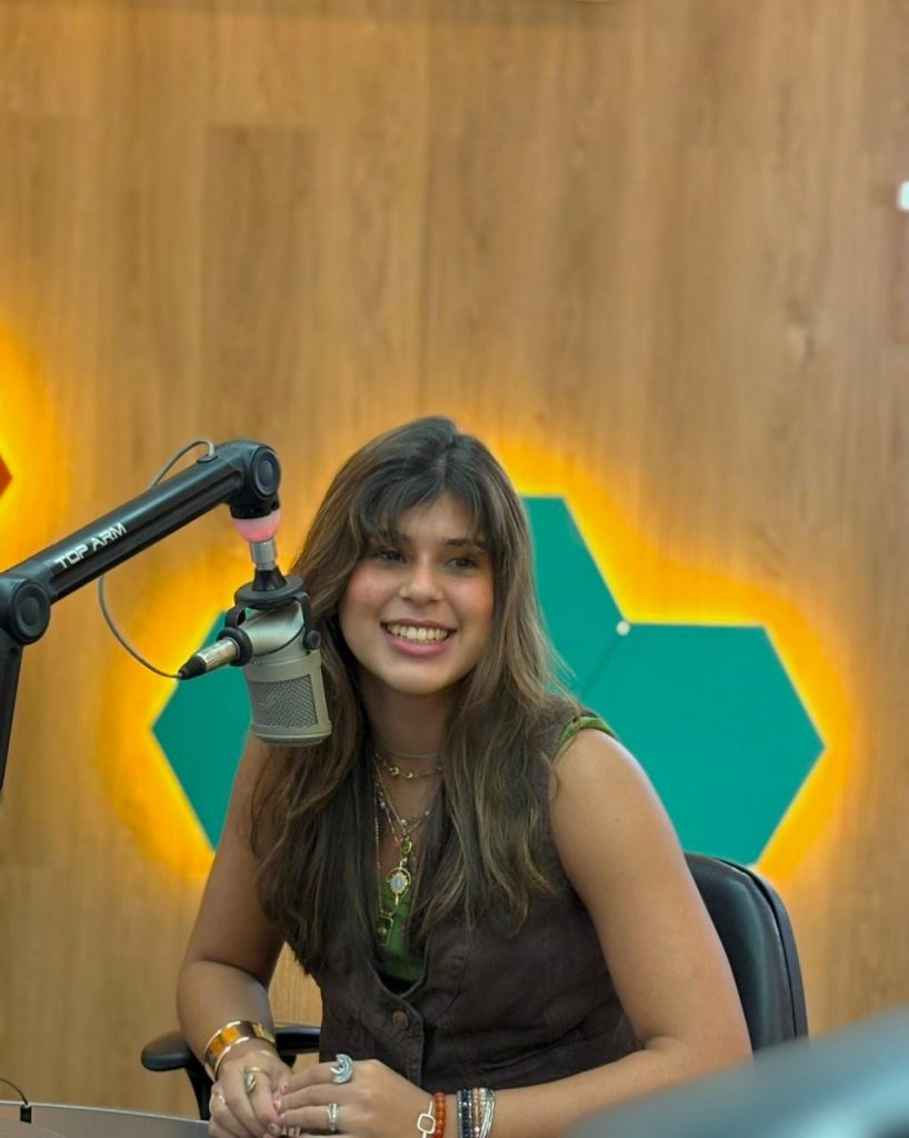 (Foto de autoria de Duda Martins): Letícia Mazullo durante entrevista na Rádio Timbira